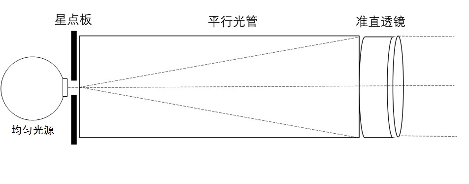均勻光源經(jīng)過星點(diǎn)板后,再由平行光管準(zhǔn)直出射光,在30m遠(yuǎn)處形成直徑80mm的光斑,光斑亮度滿足-1~7等星的亮度要求,平行光管將光線準(zhǔn)直,發(fā)散角小于 0.003°,出射光亮度通過調(diào)節(jié)光源電流進(jìn)行控制。