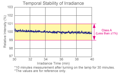 ![]() | 均勻性 在350-1800nm的范圍內(nèi),1太陽(yáng)的計(jì)算值大約是94.4 mw/cm。 工作距離:大約220毫米可以通過(guò)光強(qiáng)度控制來(lái)調(diào)節(jié)由燈壽命引起的光強(qiáng)度下降。超過(guò)A類區(qū)域的大小是參考值。請(qǐng)注意,燈的輸出因制造批次而異。它需要分別檢查光強(qiáng)度。 |