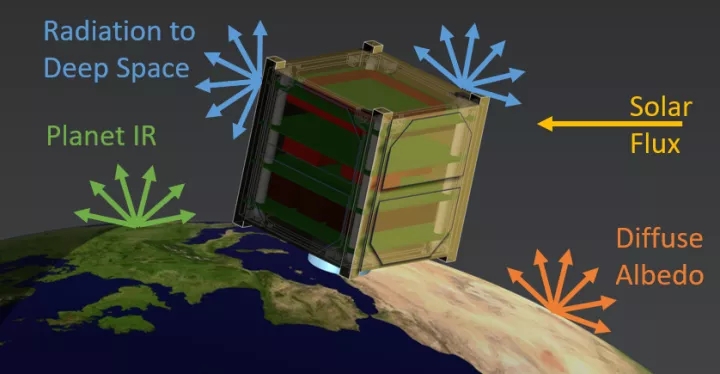 其次,對于近地軌道上的衛(wèi)星,入射到地球日光側的太陽光通量會被漫反射到衛(wèi)星朝向地球一側的表面。這些反射的大小取決于地球的局部表面特性以及不斷變化的大氣條件??偟膩碚f,漫反射太陽光通量大約是直接太陽光通量的三分之一,被稱為反照率通量。當衛(wèi)星進入日食時,這些直接的太陽光通量和反照率載荷下降為零,但有一個第三環(huán)境熱源始終存在。地球是溫暖的,相當于一個漫射器,其紅外輻射的大小是緯度和經(jīng)度的函數(shù)。知道這些隨時間變化的環(huán)境通量,以及它們在衛(wèi)星表面的分布,是計算衛(wèi)星溫度所需要的輸入,這涉及到求解固體部分的熱傳導和所有暴露表面的輻射。通常將這些環(huán)境通量分為兩個波段:太陽波段和環(huán)境波段。
