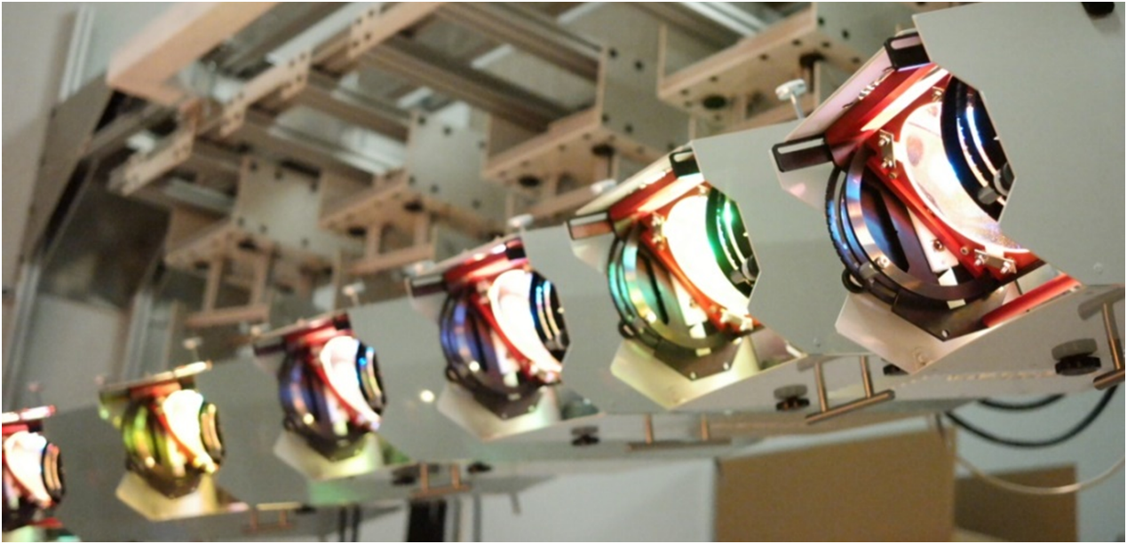 我們使用了8個(gè)2kW的QTH燈提供了1.5 x 1.5m2的輻照面積。輻照強(qiáng)度從1個(gè)太陽到0.1個(gè)太陽可調(diào)。客戶要求將光譜限制在紅外波長(zhǎng)范圍內(nèi)。